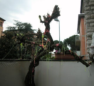 Prendete due bimbi reduci da una festa di carnevale, un paio di bombolette di stelle filanti spray, un povero albero reduce dalla potatura, mettete tutto insieme alla voglia di divertirsi, mescolate il tutto ed ecco a voi l'Albero di Carnevale: